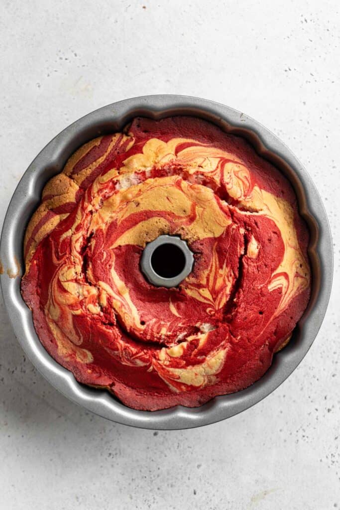 - Make clean swirls. Drop the batters in, then use a skewer to make big swoops first. Step back, see what it’s giving, then make smaller swirls. Don’t overdo it or the colors in your red velvet swirl cake will blend.
